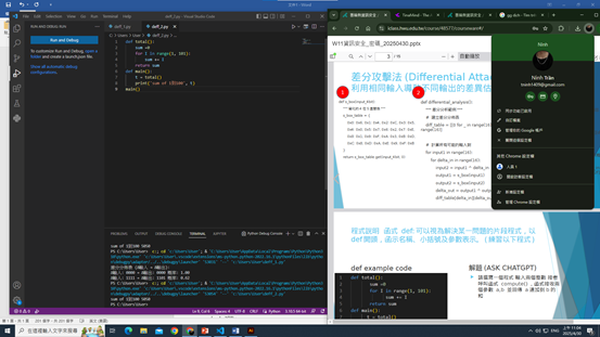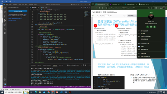 今天我完成了差分攻擊與線性攻擊的程式與執行,也練習了函式 def、for in range 迴圈。將 S 盒改為 0000-9999,並試寫亂數產生器。雖然過程有挑戰,但每一步都是成長。